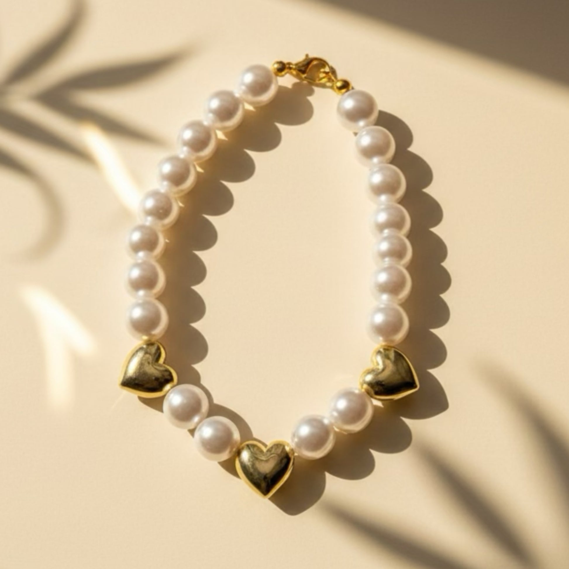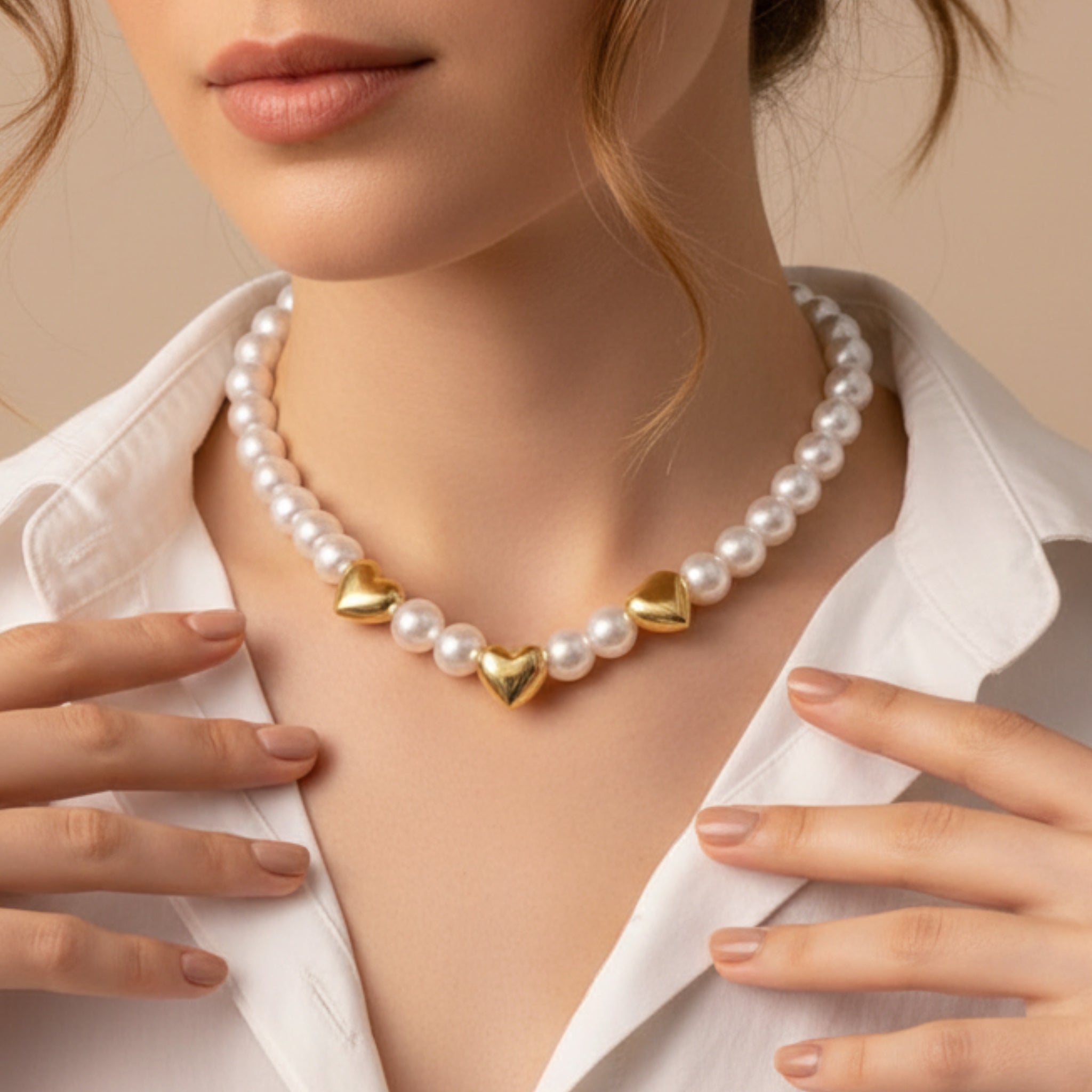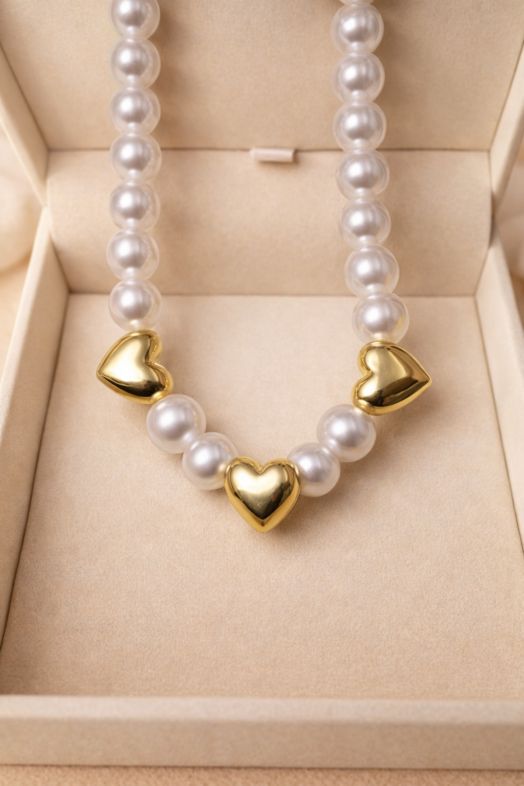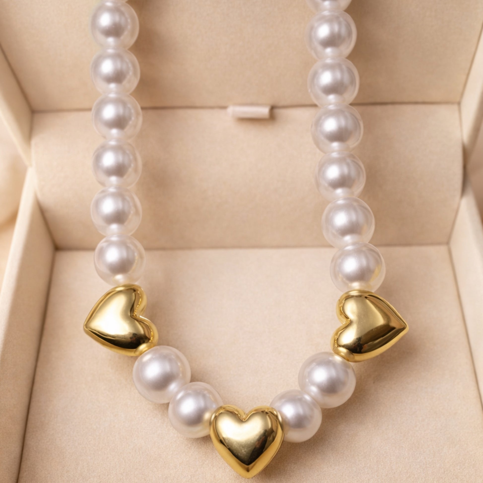 Perle come promesse, cuori come verità. Questa collana nasce dall’incontro tra la luce gentile delle perle e l’oro caldo dei cuori, simboli di amore custodito e bellezza senza tempo. Un gioiello che non segue le mode: le attraversa, con grazia. Da indossare quando vuoi sentirti scelta, amata, a casa.