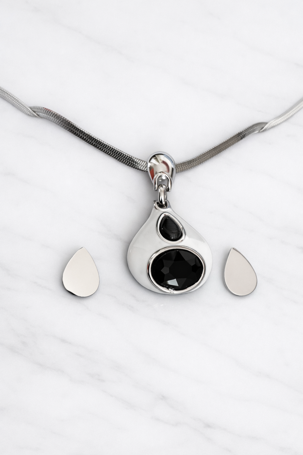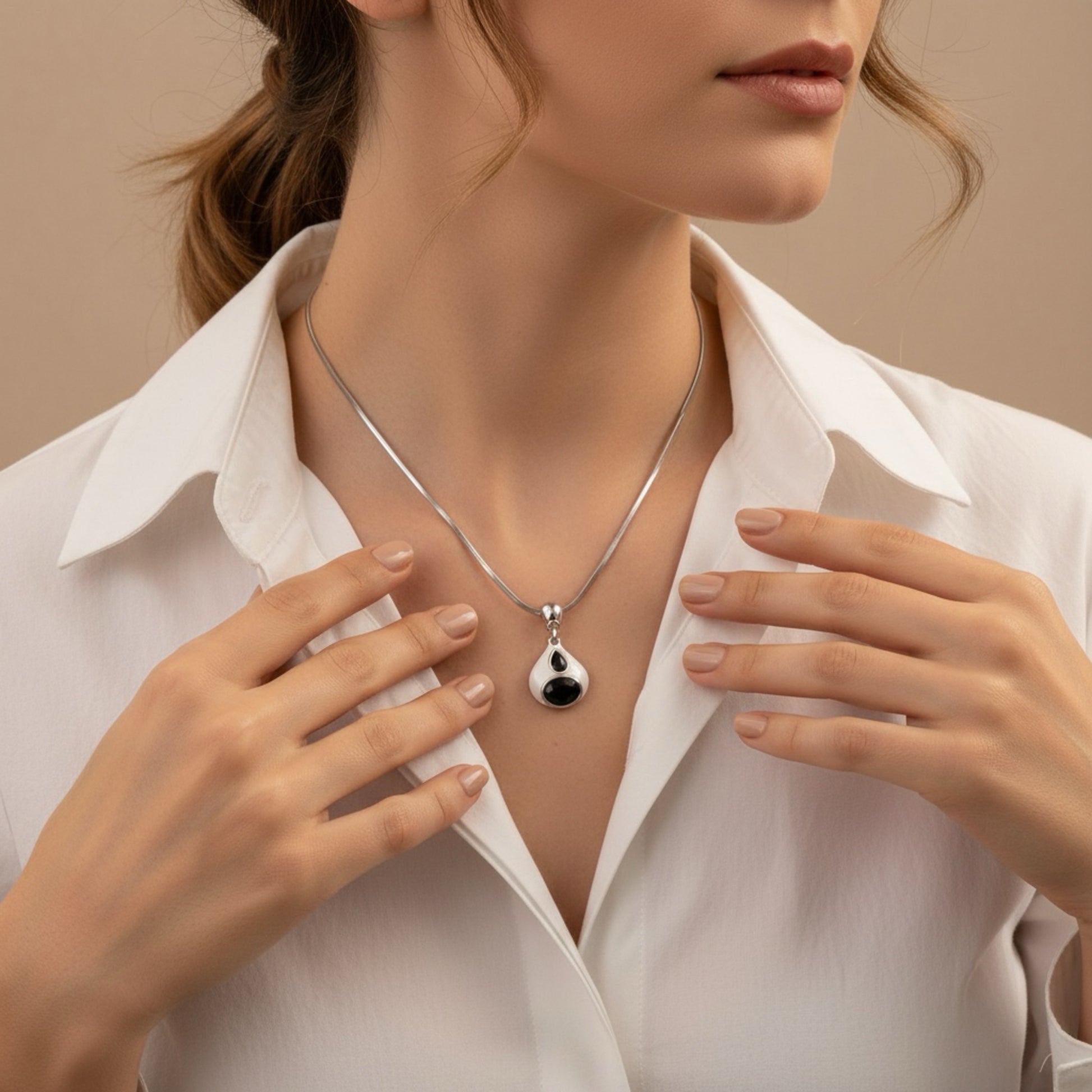 Una forma che non chiede spazio, eppure cattura lo sguardo. Goccia Silente è un incontro tra superfici lucide e profondità scure: la calma dell’argento, la fermezza del nero. La pietra sfaccettata raccoglie la luce come acqua immobile, mentre il metallo la accompagna senza rumore, con la pazienza delle cose che restano.